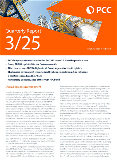 Duisburg, November 14, 2025. Duisburg-based investment holding company PCC SE achieved earnings improvements in the third quarter of 2025, with almost all segments increasing their EBITDA (earnings before interest, taxes, depreciation, and amortization). However, Group sales fell slightly. The quarter was characterized by continued strong price competition from non-European manufacturers. Compensations for CO2 certificates for our energy-efficient chlorine production had a positive effect, while rising fixed costs and interest expenses had a negative impact on earnings.